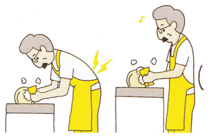 掃除機掛けや掃き掃除をするときは、前かがみになりがちです。掃除機掛けは、ひざの屈伸を使い、できるだけ胸を張り、腰椎前弯を保つ姿勢を取りましょう。 - 炊事