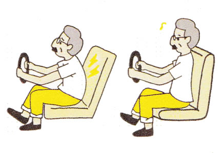 運転に集中すると、あごが前に出て腰椎前弯が消える座り姿勢になりがちです。座席に深く腰掛け、シートを倒しすぎないようにして、背すじを伸ばして運転してください。