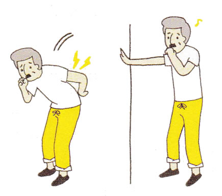 重い荷物を持ち上げるときには、まず腰椎の前弯(弓状のカーブ)を保ったまま、ひざを深く曲げて腰を落としてしゃがみ、荷物に体を近づけます。最も注意してほしいのは、ひざをのばしたままでの中腰姿勢にならないということです。中腰姿勢でいるだけでも、腰椎の椎間板に偏った圧力がかかりますが、中腰姿勢で重い荷物を持つと、腰への負担はさらに大きくなります。実際に、中腰姿勢の場合、軽い荷物を持っただけでも、腰痛を起こす危険があります。例えば、床に置いてある新聞を取ろうとしただけで、腰痛を起こすこともあります。床に置いてある重い荷物を持つときは、めんどうでも腰を反らし、腰椎前弯のある姿勢を作ってから、ひざを深く曲げて腰を落としてしゃがみこんでください。そして、持ち上げる荷物に、体を近づけます。荷物が体から離れれば離れるほど、持ち上げたときに腰椎の前彎は保てなくなります。荷物を持ったら、ひざを伸ばす力で荷物を上に持ち上げます。腕だけの力で荷物を持ち上げようとすると、腰椎の椎間板に負担がかかりやすくなります。しゃがんだ姿勢から立ち上がるときは、ひざの力を利用して、反動をつけずに荷物を持ち上げてください。もちろん、立ち上がるときは、腰椎前弯を保つようにします。そして、荷物を持つ前後で、立って行う腰反らしも行い髄核のズレを直しておけば、腰痛を防ぐ効果がいっそう高まります。荷物が何個もあるときは、面倒でも一つのものを持ち運びする度に、腰反らしを行うといいでしょう。 - セキ・クシャミ