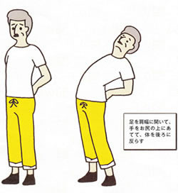まず基本となる後屈運動を行います。後屈運動後屈運動は、肩幅に足を開いて立った姿勢で、腰に手を当てて腰を反らしていきます。この後屈運動を10回行って、「痛みの範囲」「痛みの強さ」「動きやすさ」の三項目で痛みが改善したかどうかを確認します。一度だけの運動で判断してはいけません。1回目の運動で痛みが出ても、運動を繰り返すうちに、徐々に痛みが改善することもあるので、運動は必ず10回程度反復して行ってください。後屈運動を行った直後に運動前より痛みが改善すれば、「後屈改善型腰痛」と判定されます。後屈運動刺激を継続するために壁反らしに進みます。