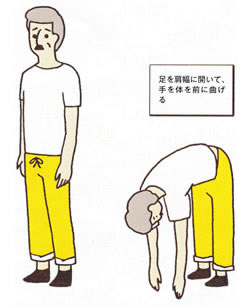 痛みが運動前と変わらなかったり、逆に悪化したりした人は、後屈改善型腰痛には該当しません。次の前屈運動を一〇回行って、直後の痛みの変化を確認してください。前屈運動は、腰幅に足を開いて立った姿勢で、前に腰を曲げていきます。この前屈運動を10回行って運動の直後に、「痛みの範囲」「痛みの強さ」「動きやすさ」の三項目で痛みが改善したかどうかを判定します。前屈運動で改善したら、「前屈改善型腰痛」というタイプに分類されます。前屈運動刺激を継続するために壁おじぎに進みます。