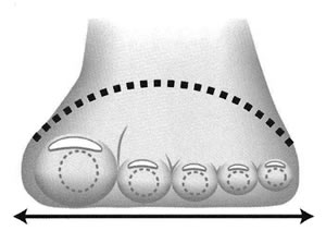 - 開張足の人は幅広の靴を選びがちです。幅広の靴はあし指が圧迫されないことはいいのですが、幅広の靴だけでは横アーチがますますつぶれてしまいます。靴のインソールに中足骨の中央部分を盛り上げる中足骨パッドを入れて、横アーチを支えることが大切です。