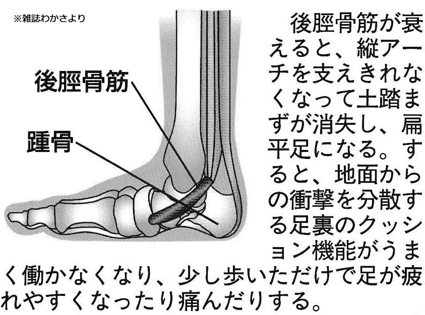- 後脛骨筋機能不全は様々な臨床所見が合わさった症候群で、痛みはあるが機能は保たれたステージ1から、運動機能が失われ変形が著名なステージ4までのステージ分類があります。ステージ1は、内くるぶしの先端から後方にかけての腫脹と疼痛があり、後脛骨筋腱の炎症が痛みを引き起こしているが、後脛骨筋腱の長さは保たれており運動機能は正常で変形も来たしていない状態です。ステージ2は、後脛骨筋腱は変性により伸張した状態で、荷重時には後足部が外反するが、変形は徒手的に矯正可能です。ステージ3は、後脛骨筋腱は完全に伸びきってその運動機能が完全に失われ、関節の変形が固まった状態です。前足部の内反変形と後足部の外反変形は著明で、徒手的な矯正は不可能です。ステージ4は、足関節への慢性的な外反負荷により、足関節の変形を来たした状態である。距骨の外反変形がみとめられます。