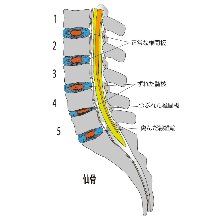 椎間板は姿勢や動作の影響で負担がかかりますが、髄核がずれて線維輪に亀裂が入ると痛みが生じた状態を腰椎椎間板症と呼びます。症状は腰痛で、レントゲンでは椎間板腔の狭小化がみられることもありますが、明らかな異常が認められないこともあります。